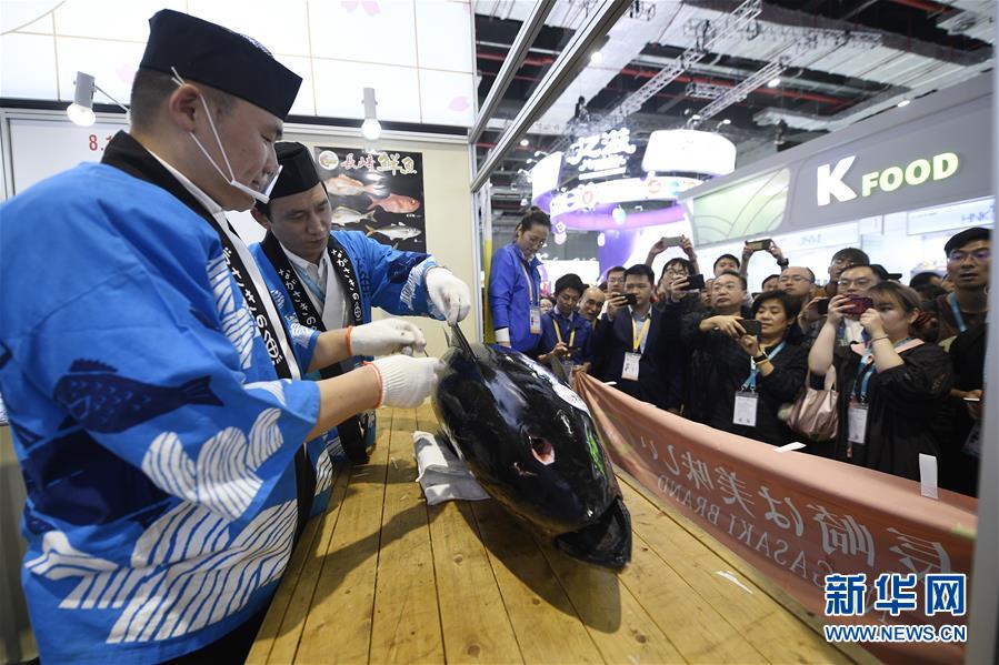 11月7日,來自日本長(zhǎng)崎魚市株式會(huì)社的專業(yè)切魚師傅為解體70公斤藍(lán)鰭金槍魚做準(zhǔn)備。第二屆中國國際進(jìn)口博覽會(huì)正在上海國家會(huì)展中心舉行。博覽會(huì)的食品及農(nóng)產(chǎn)品展區(qū)里匯集了來自世界各地的美食,同時(shí)也上演各種精彩美食秀。11月7日,來自日本長(zhǎng)崎魚市株式會(huì)社的專業(yè)切魚師傅現(xiàn)場(chǎng)解體一條70公斤的藍(lán)鰭金槍魚,吸引大量參觀者觀看、品嘗。新華社記者王鵬攝