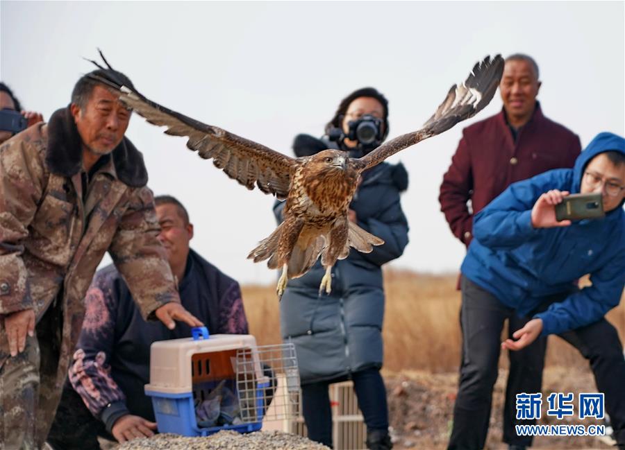 11月16日,在樂亭縣野生動物保護協(xié)會大清河鳥類救助站,工作人員放飛一只普通鵟。新華社記者楊世堯攝