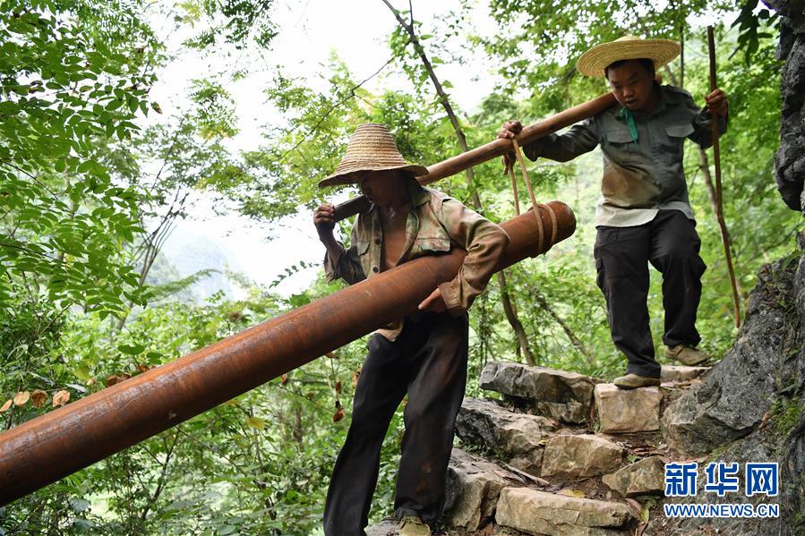 在廣西大化瑤族自治縣板升鄉(xiāng)弄雷村,工人們抬著抗旱飲水工程的水管在山路上前行(2016年8月10日攝)。新華社記者黃孝邦攝