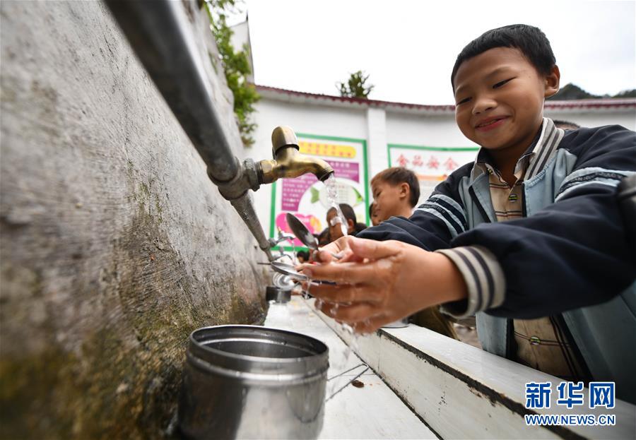 在廣西大化瑤族自治縣板升鄉(xiāng)八好小學(xué),同學(xué)們?cè)谟米詠?lái)水洗餐具(11月13日攝)。新華社記者黃孝邦攝