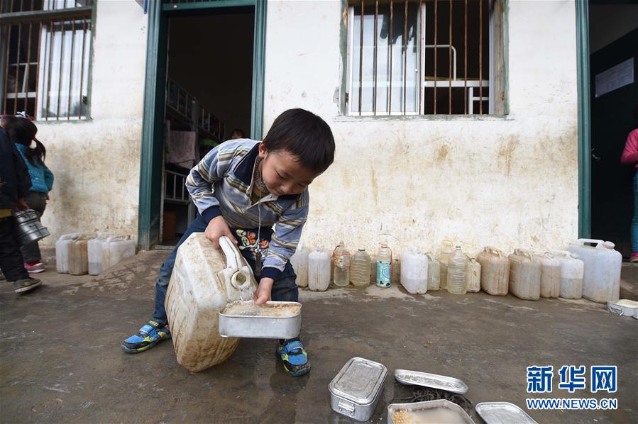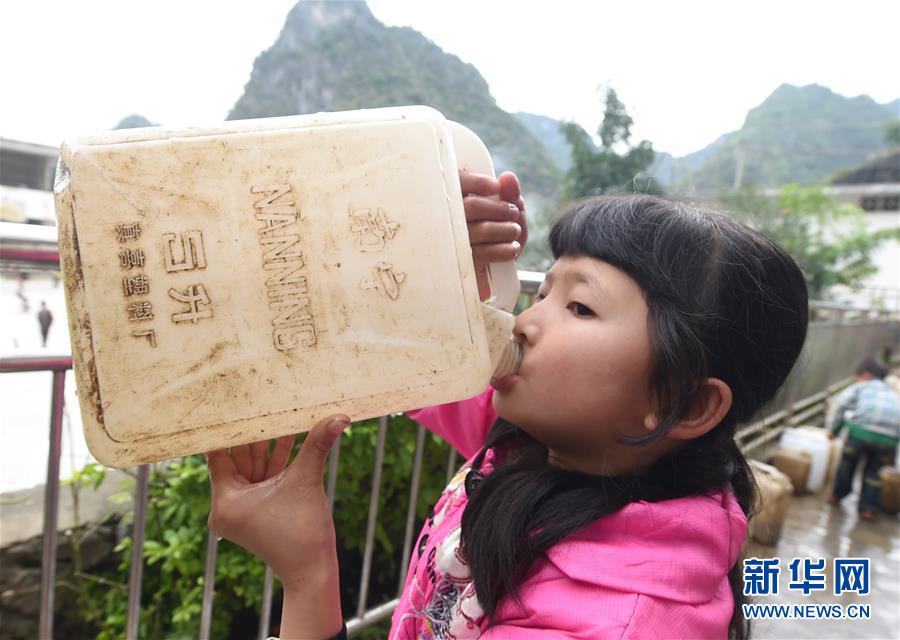 在廣西大化瑤族自治縣板升鄉(xiāng)八好小學(xué),一名學(xué)生喝水桶里的雨水(2014年11月24日攝)。八好小學(xué)有400多名學(xué)生,曾僅有一個(gè)不足100立方米的水柜,用于收集儲(chǔ)存樓頂?shù)挠晁?,學(xué)生需定期定量用水。遇到長(zhǎng)時(shí)間不下雨,學(xué)校需要到鄉(xiāng)政府所在地運(yùn)水。如今,學(xué)校修建了5個(gè)大水柜,并從兩公里外引泉水到校園,飲水難問(wèn)題得到解決。新華社記者黃孝邦攝