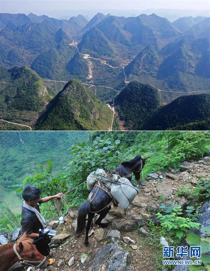 拼版照片:上圖為已經(jīng)修通水泥路的大化瑤族自治縣板升鄉(xiāng)八好村八好屯(11月11日無(wú)人機(jī)拍攝);下圖為在尚未通路的八好村八好屯,村民背著化肥走山路回家(2016年4月15日攝)。新華社記者黃孝邦攝