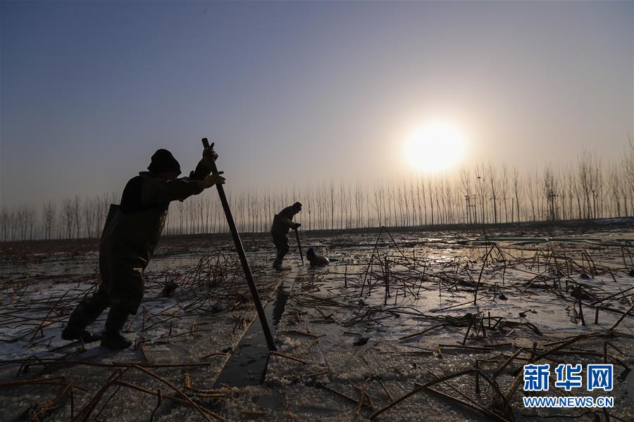 2月1日,在雄安新區(qū)安新縣東向陽(yáng)村的一處藕塘,挖藕工將塘面結(jié)的冰用電鋸切成小塊后挪開(kāi)。新華社記者沈伯韓攝