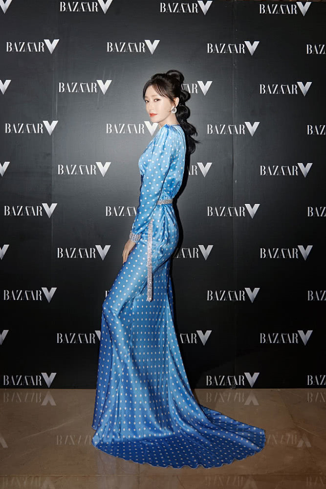 秦嵐穿波點(diǎn)藍(lán)裙身姿婀娜,靈動(dòng)飄逸似美人魚。