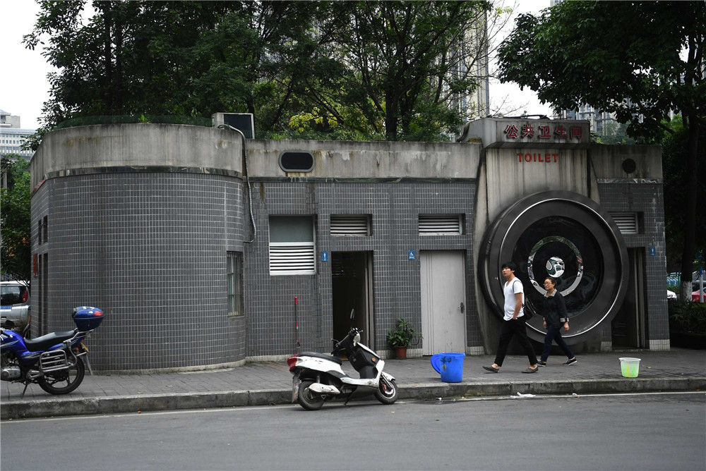 2017年5月5日,重慶,市民經(jīng)過街頭創(chuàng)意“照相機(jī)”廁所都會(huì)駐足觀看。以“照相機(jī)”外形來(lái)修建的公共衛(wèi)生間,成為一道創(chuàng)意城市風(fēng)景線。徐勇/視覺中國(guó)