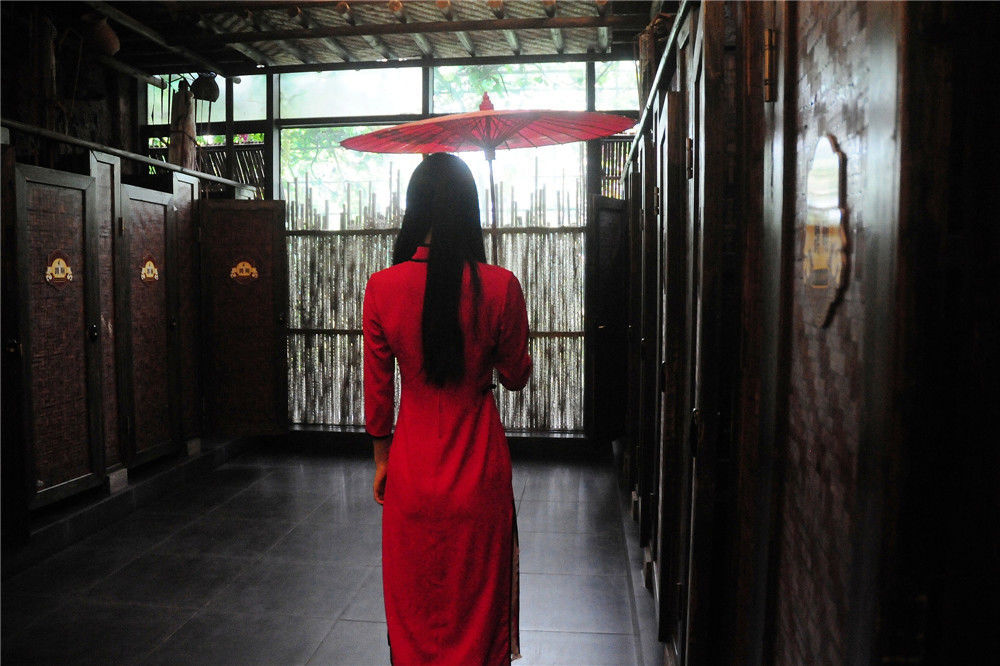 2016年09月29日,杭州,在女廁所,里面也是機(jī)關(guān)重重,讓許多游客不敢進(jìn)去,里面還有人扮演紅衣女鬼,撐著紅傘時(shí)不時(shí)在廁所里面走動(dòng),或者你上廁所的時(shí)候突然給你遞紙巾。益鵬/視覺中國(guó)