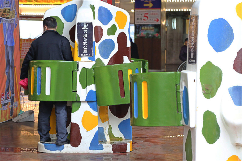 2017年3月15日,重慶,幾座“男用英式公廁”亮相洋人街景區(qū)路邊。這些供男士小便專用的露天公廁,每座有4個(gè)站位,仿造英式廁所建造,四面透風(fēng),只遮擋住腰部的部分。左冬辰/視覺中國(guó)