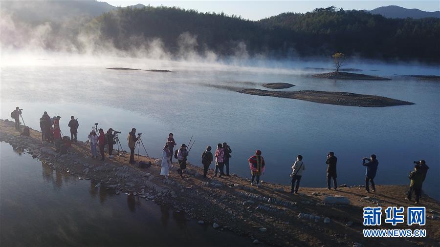 這是11月14日無人機(jī)拍攝的安徽黟縣奇墅湖晨景。新華社記者張端攝
