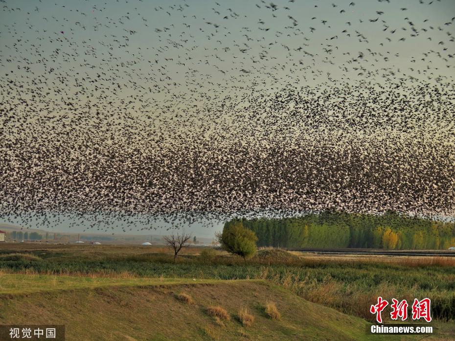 近日,土耳其穆什,椋鳥(niǎo)群遷徙途中,黑壓壓一片遮擋天空。圖片來(lái)源:視覺(jué)中國(guó)