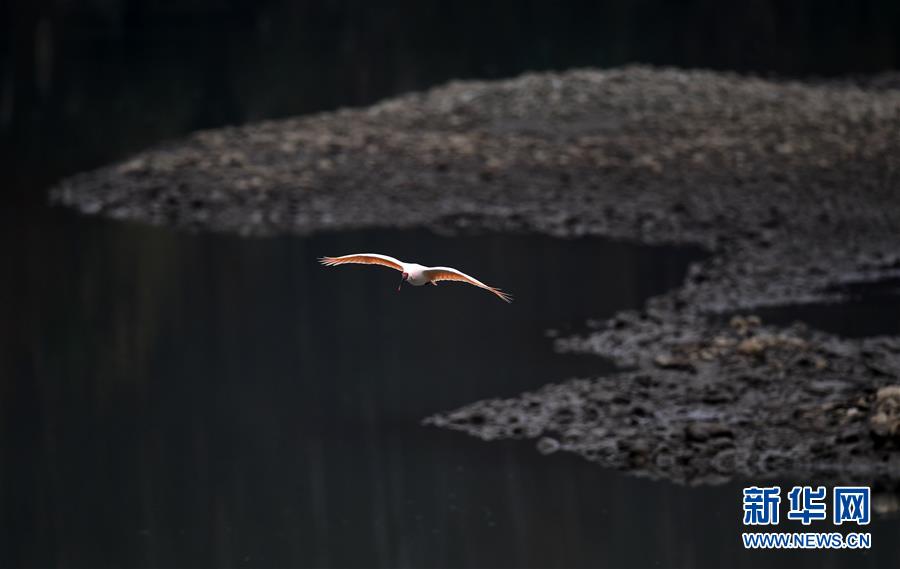 11月19日,朱鹮飛翔在漢江支流的牧馬河畔。 每年冬季,成群結(jié)隊的朱鹮飛翔在漢江及漢江支流的河灘、濕地,覓食、棲息,成為當?shù)匾坏懒聋惖娘L景線。 新華社記者陶明攝
