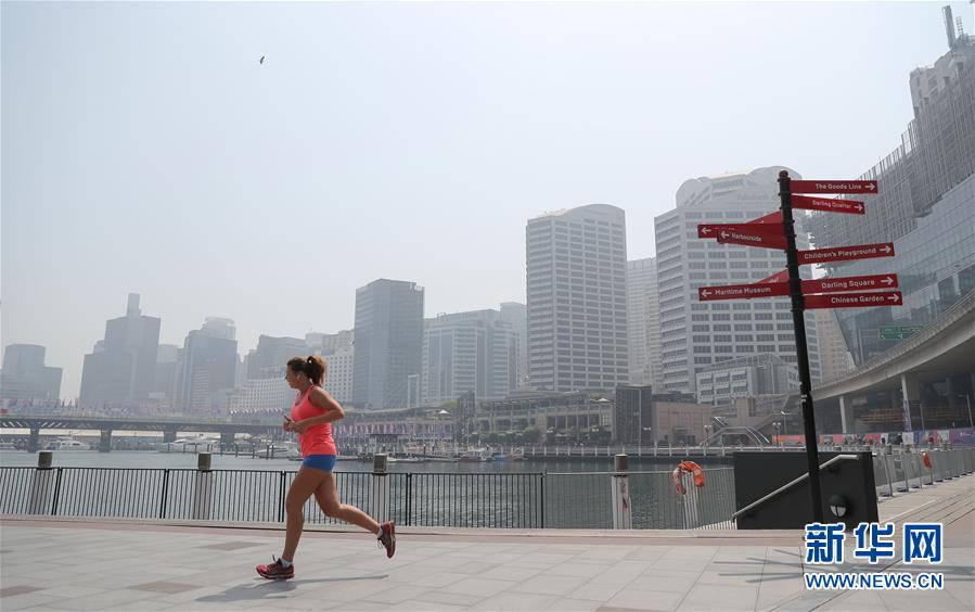 11月21日,在濃煙籠罩下的澳大利亞悉尼達(dá)令港,一名女子在港口步道上跑步。澳大利亞東部近期林火肆虐,悉尼所在的新南威爾士州自進(jìn)入今年林火季以來,過火面積超過100萬公頃。林火造成悉尼濃煙圍城,市民生活受到影響。新華社記者白雪飛攝