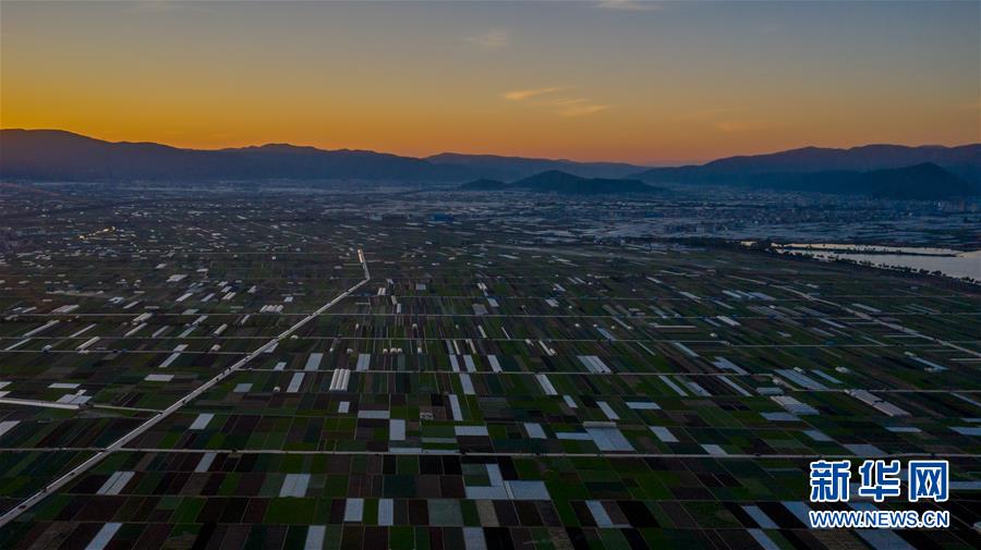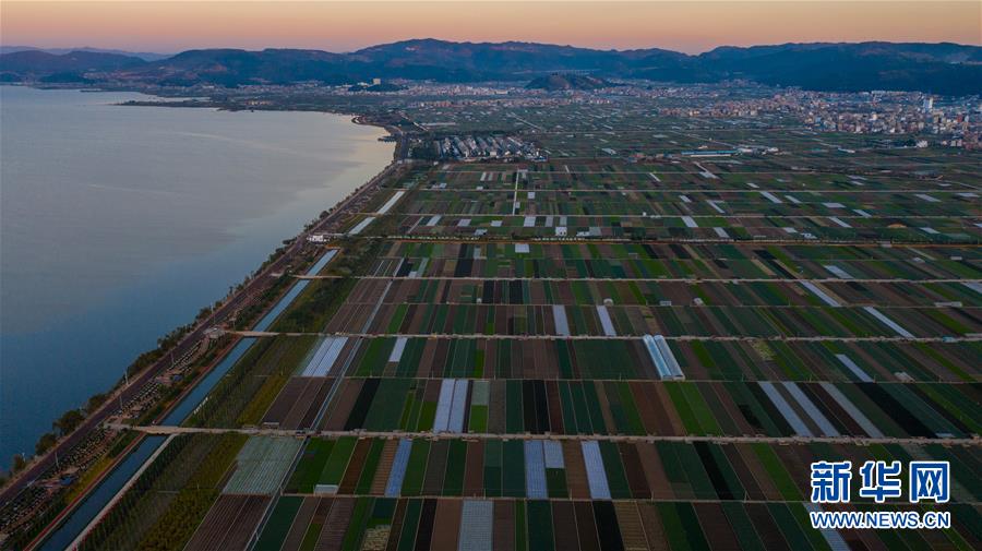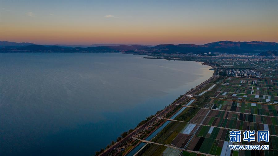 這是云南省玉溪市通??h的田園風光(11月23日無人機拍攝)。初冬時節(jié),云南省玉溪市通海縣風景秀麗,山巒、湖水與農田組成了一幅美麗的田園詩畫卷。新華社記者胡超攝
