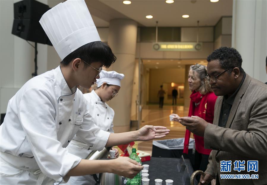 11月22日,在美國華盛頓,人們在“北京日”文化廟會活動上品嘗中國小吃。作為中國北京和美國首都華盛頓締結(jié)友好城市35周年慶?;顒拥囊徊糠?,“北京日”文化廟會22日在華盛頓羅納德·里根大廈和國際貿(mào)易中心舉行。新華社記者劉杰攝