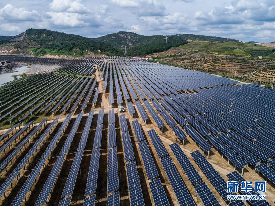 空中俯瞰湖州市埭溪鎮(zhèn)東紅村的光伏發(fā)電站(9月26日無人機(jī)拍攝)。該光伏電站占地2500多畝,是當(dāng)?shù)貜U棄礦坑通過改造建成的“農(nóng)光互補(bǔ)”光伏發(fā)電站。