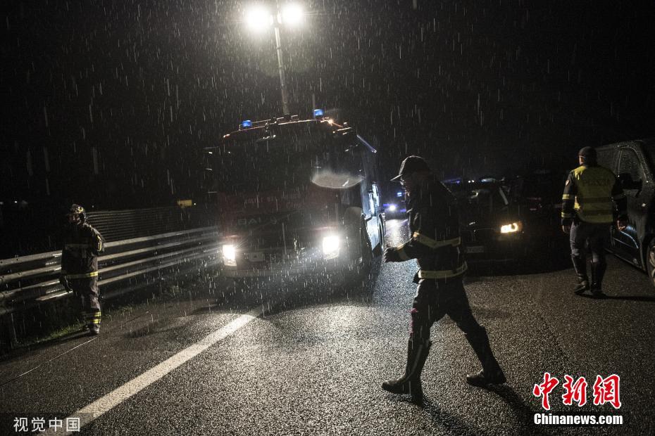 當(dāng)?shù)貢r(shí)間2019年11月24日,意大利Villafranca dAsti,意大利遭受惡劣天氣和持續(xù)多日的暴雨,通往都靈方向的A21高速公路路面出現(xiàn)“大坑”。圖片來(lái)源:視覺(jué)中國(guó)