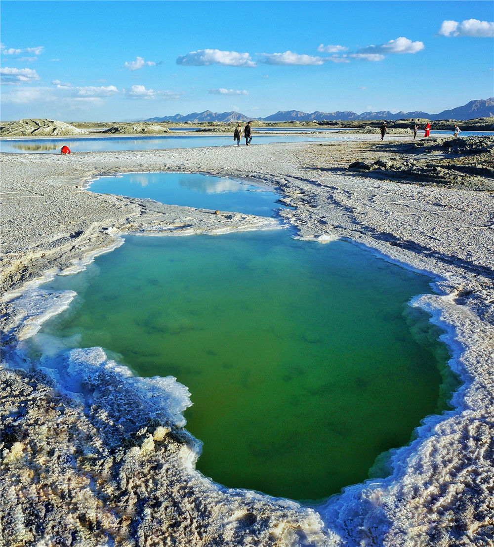 在青海柴達(dá)木盆地最西部的茫崖有一處硫酸鎂亞型人工鹽湖,以其翡翠綠色的鹽田與藍(lán)天白云和附近的丹霞地貌相映。李仁奇攝
