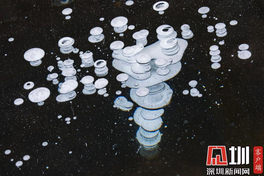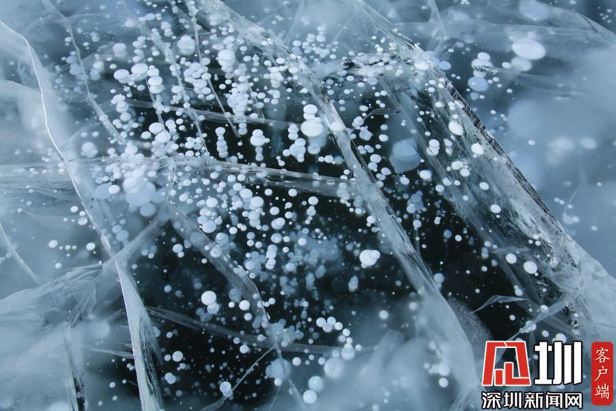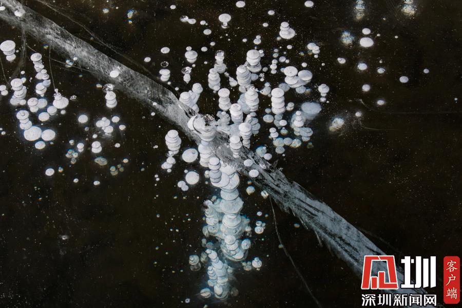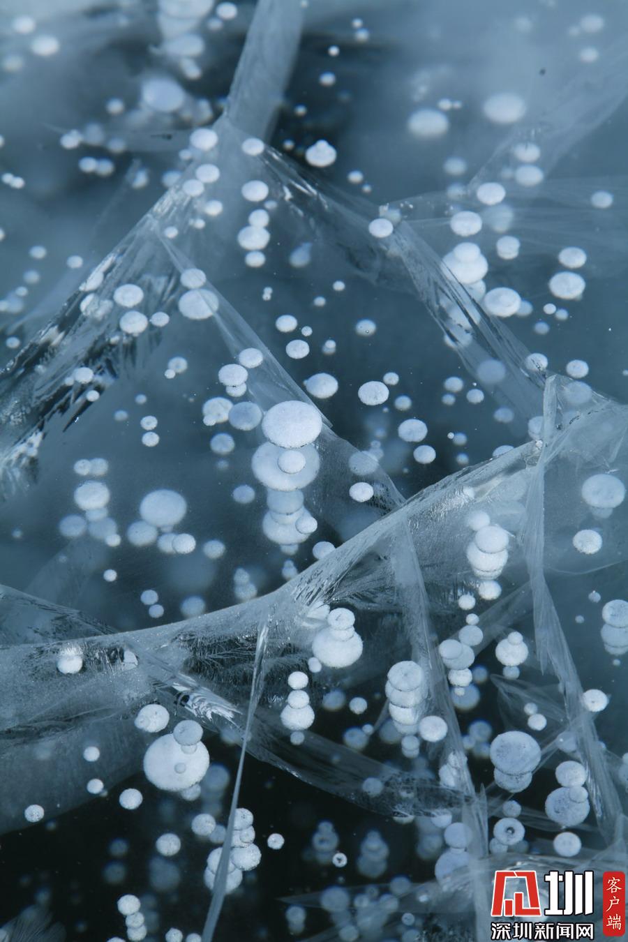 透過(guò)晶瑩剔透的冰面,可以看到一串串潔白氣泡分布在冰層中。