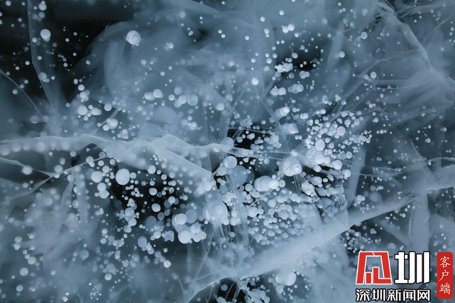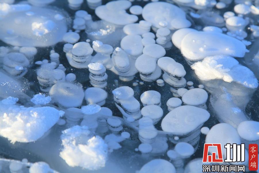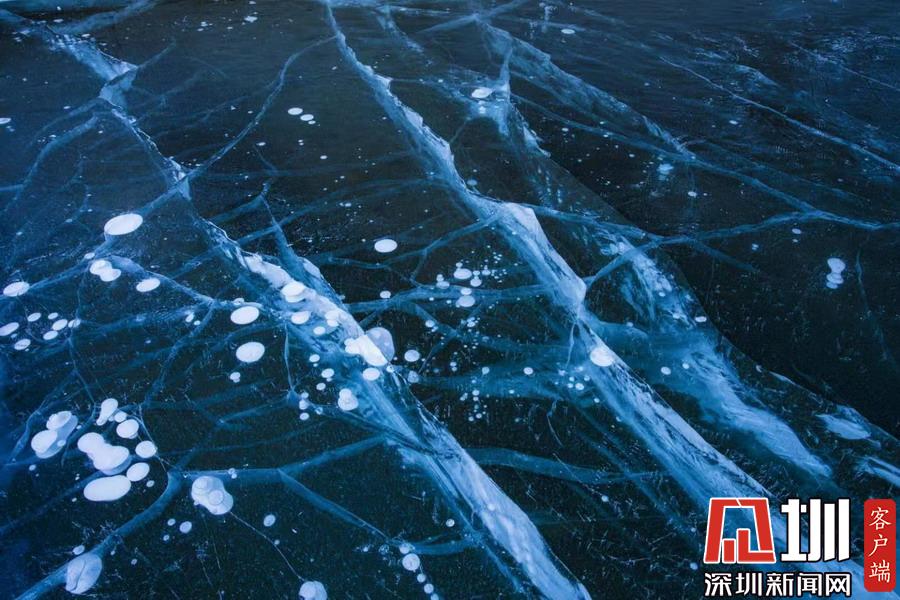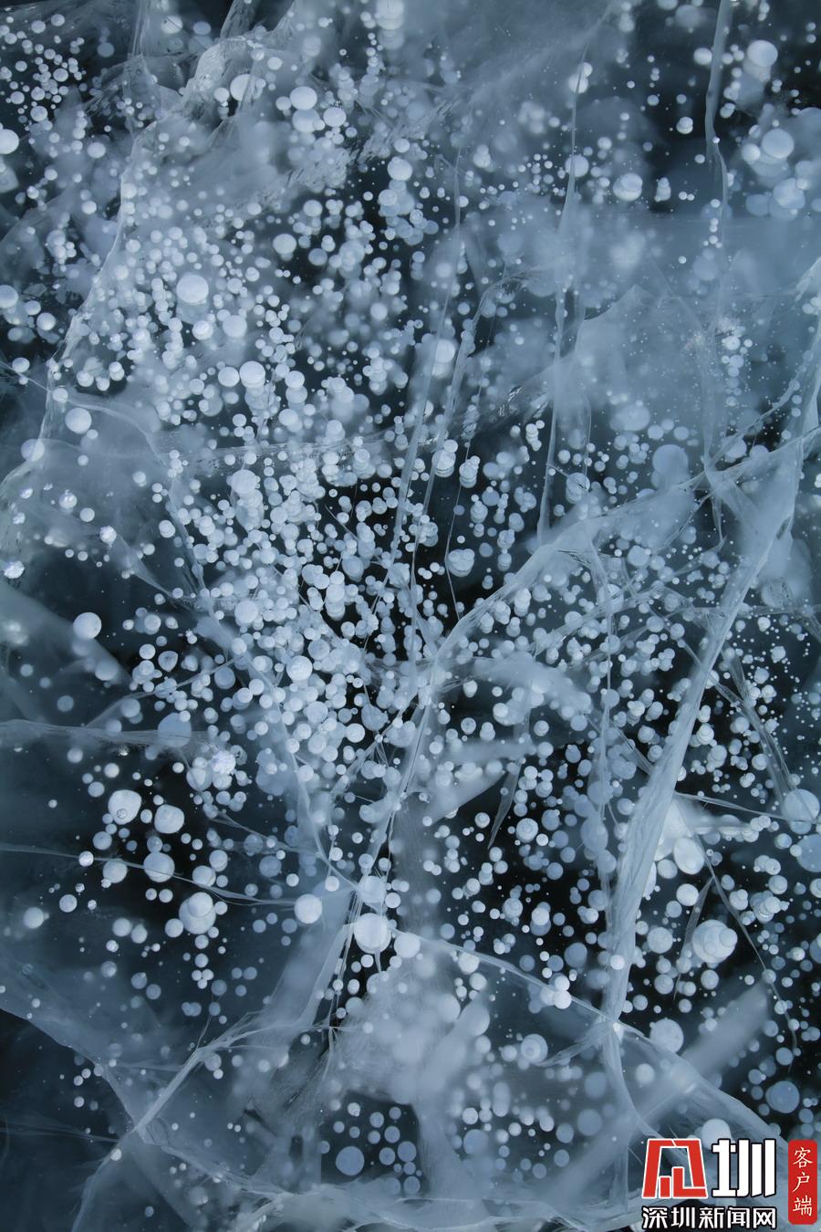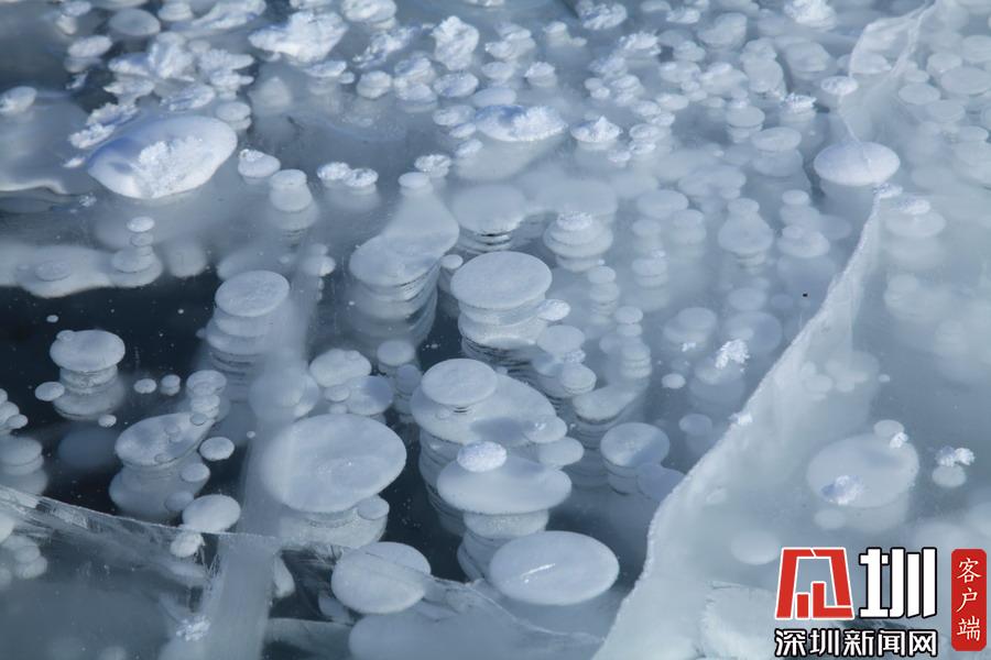 透過(guò)晶瑩剔透的冰面,可以看到一串串潔白氣泡分布在冰層中。