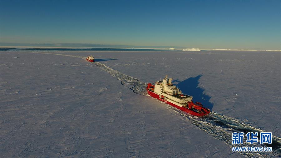 “雪龍”號(hào)與“雪龍2”號(hào)在新開辟的航道上(11月21日無(wú)人機(jī)拍攝)。