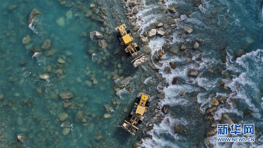 在新疆塔什庫(kù)爾干塔吉克自治縣大同鄉(xiāng)庫(kù)如克欄桿村,電力工人利用施工車輛運(yùn)送水泥、鐵塔零件過河,為鋪設(shè)線路做準(zhǔn)備(11月24日無(wú)人機(jī)拍攝)。