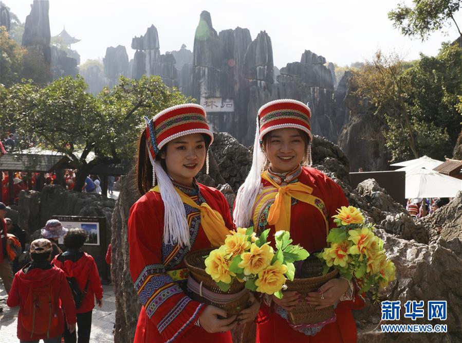 當(dāng)?shù)厣贁?shù)民族樂(lè)手在石林景區(qū)演奏民族音樂(lè)(11月27日攝)。新華社記者蘭紅光攝