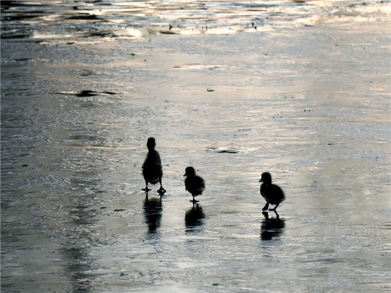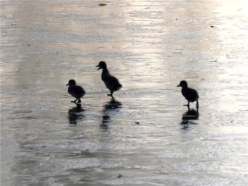 2019年12月2日,北京玉淵潭公園湖畔,三只野鴨寶寶在冰面上行走、湖中游弋,呆萌可愛(ài)。