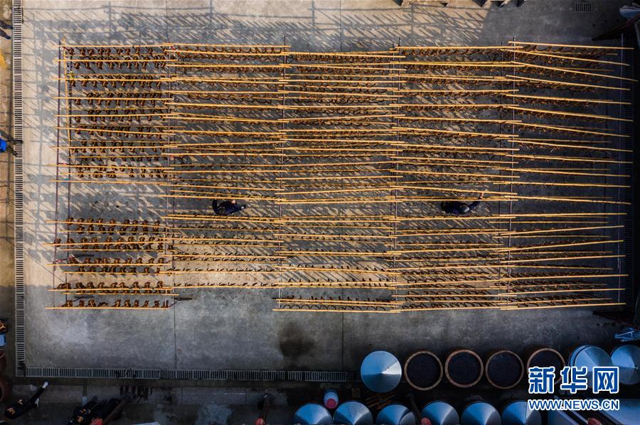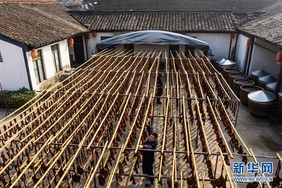 初冬時(shí)節(jié),浙江省紹興市柯橋區(qū)安昌古鎮(zhèn)開啟了傳統(tǒng)臘味制作、上市的季節(jié)。當(dāng)?shù)匕傩沼脗鹘y(tǒng)醬油、黃酒、香料等手工腌制臘腸、醬鴨、魚干、醬鵪鶉、醬排骨等紹興特色醬貨,在冬季的陽光下進(jìn)行晾曬,滿街飄香的臘味也成了這座江南古鎮(zhèn)的獨(dú)特風(fēng)景。安昌古鎮(zhèn)是浙江省歷史文化名鎮(zhèn),有著一千多年歷史,比較完善地保存了古吳越地區(qū)沿襲千百年來的民俗風(fēng)情。每年大雪節(jié)氣前后,安昌當(dāng)?shù)匕傩瞻凑諅鹘y(tǒng)習(xí)俗挑選晴朗好天氣制作、晾曬傳統(tǒng)醬貨,各類醬貨顏色黑紅油亮,咸鮮適口,是當(dāng)?shù)囟镜奶厣珎鹘y(tǒng)美食。新華社記者徐昱攝