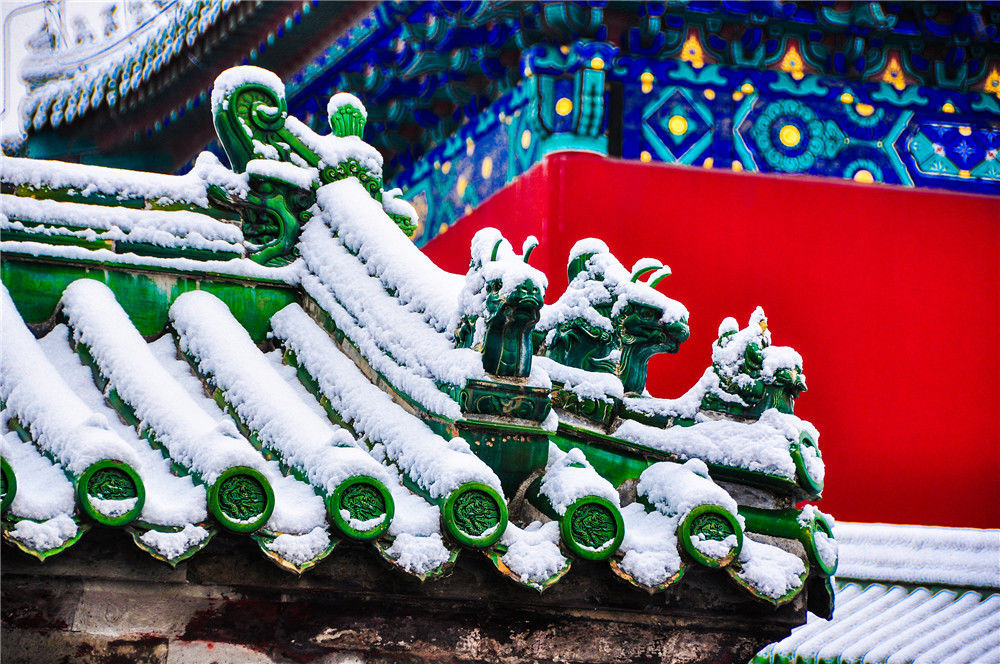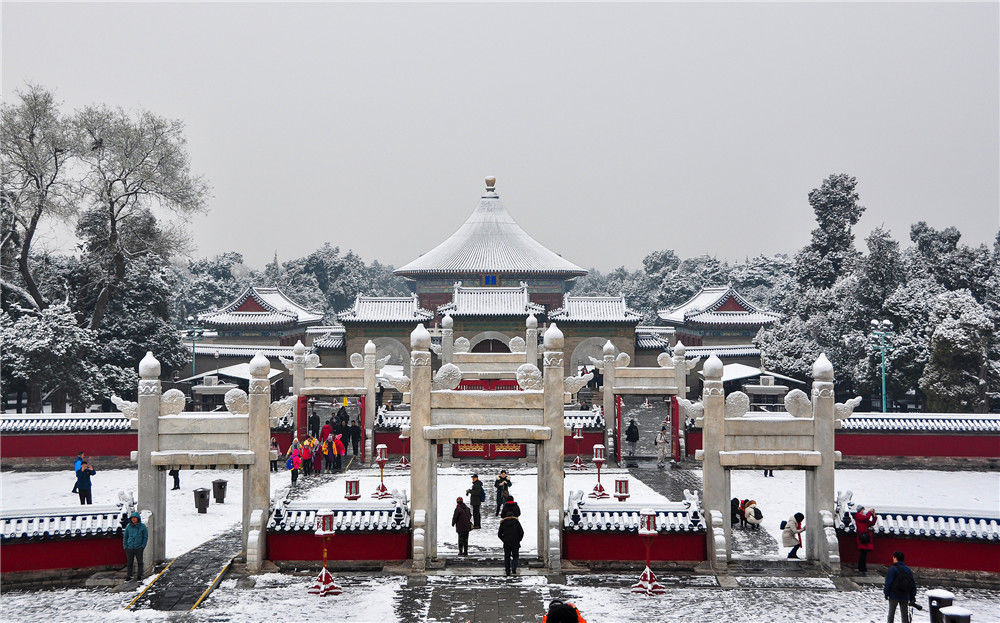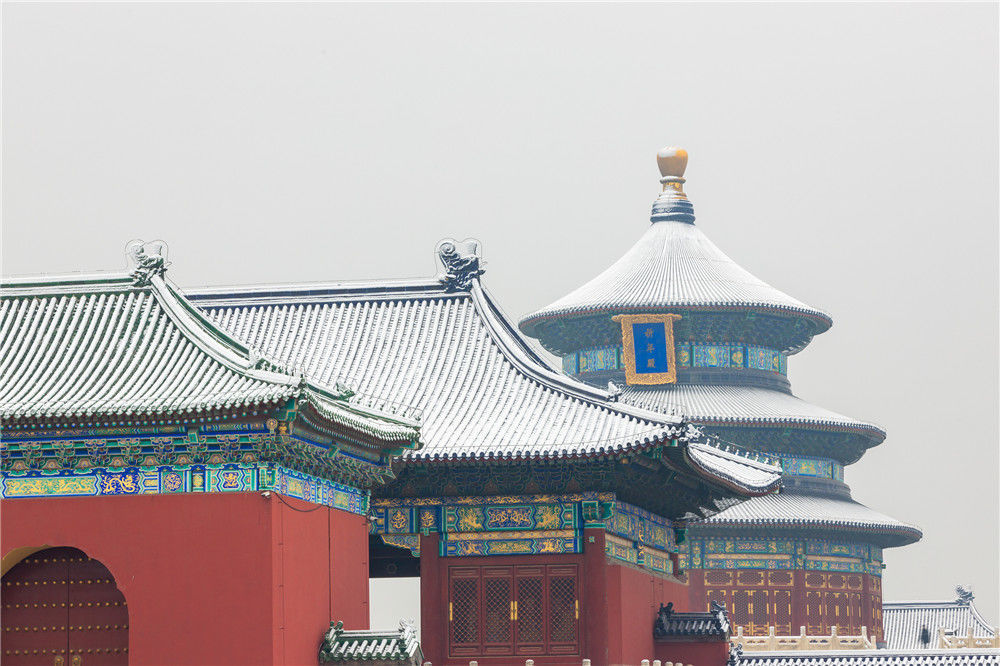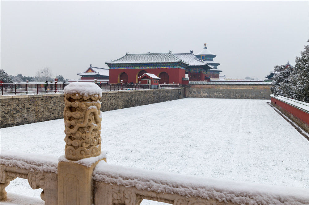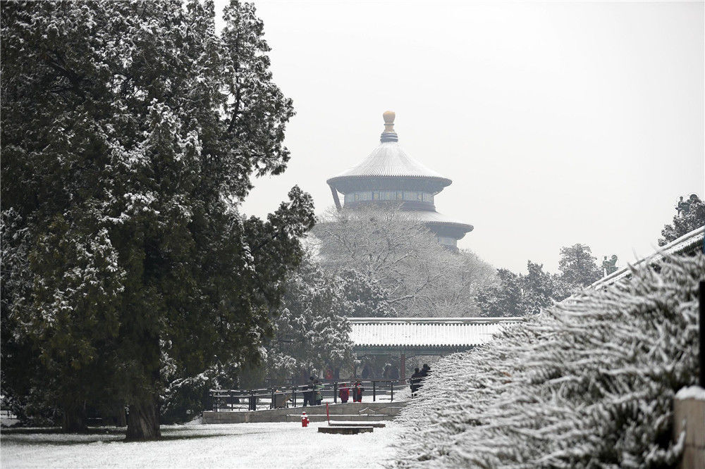 2019年11月30日,北京,初雪過后,天壇公園銀裝素裹,白雪古建相互映襯,景色迷人。時(shí)永平/千龍圖像/視覺中國(guó)