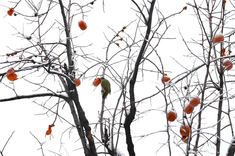 2019年11月30日,雪后的北京天壇公園內(nèi),鳥兒在柿子樹上覓食。29日,北京迎來2019年冬季初雪。富田(攝影部)/中新社/視覺中國(guó)