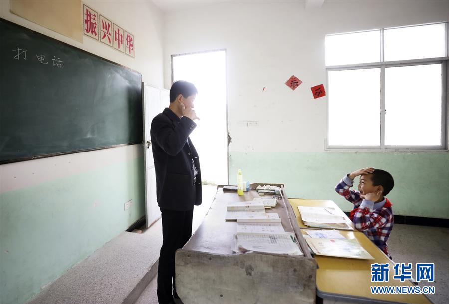 5月8日,王北海(左)在教室內(nèi)為陳威宇講解“打電話”的流程。江西省瑞金市大柏地鄉(xiāng)三河小學(xué)坐落于大山深處。陳威宇是學(xué)校里唯一的學(xué)生。陳威宇今年9歲,家庭貧困,上學(xué)不便。為解決這一難題,當(dāng)?shù)卣疀Q定恢復(fù)陳威宇家附近三河小學(xué)的辦學(xué)工作,今年46歲的王北海被安排為專職教師,從周一至周五,王北海幾乎每天24小時陪伴在陳威宇身旁,既當(dāng)老師也當(dāng)“家長”,照料他的學(xué)習(xí)和生活。新華社記者蘭紅光攝