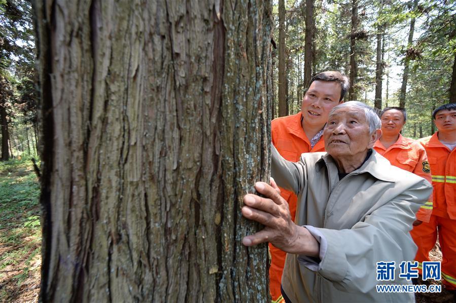 4月27日,在貴州省畢節(jié)市赫章縣平山國有林場,李代關(guān)老人(前)在查看當(dāng)年和同事種的杉樹。今年88歲的李代關(guān)是貴州省畢節(jié)市赫章縣平山國有林場的一名退休職工,他1958年參加工作,成為一名林業(yè)工人,把畢生奉獻給了林業(yè)事業(yè)。在李代關(guān)的感召下,他的兒子和孫子都成為了護林員。經(jīng)過幾代林業(yè)工人的努力,截至2018年底,赫章縣平山鎮(zhèn)的森林覆蓋率已達66.7%。新華社記者楊楹攝