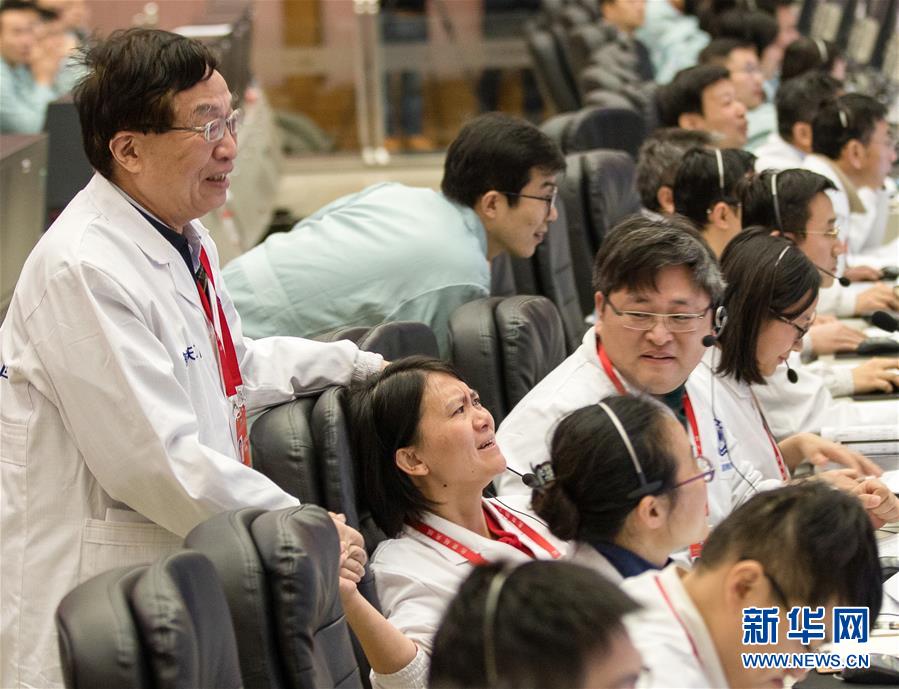 1月3日,嫦娥四號成功落月的那一刻,74歲的中國航天科技集團五院深空探測和空間科學(xué)首席科學(xué)家、嫦娥一號衛(wèi)星總設(shè)計師葉培建院士(左一)靜靜走到嫦娥四號探測器項目執(zhí)行總監(jiān)張熇的身后,對她表示祝賀和鼓勵。兩代“嫦娥人”的手緊緊握在了一起。新華社記者金立旺攝
