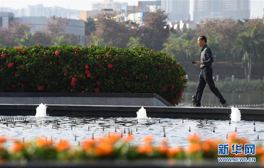 12月17日,市民從南寧市南湖邊綠樹(shù)鮮花間走過(guò)。新華社記者 陸波岸 攝