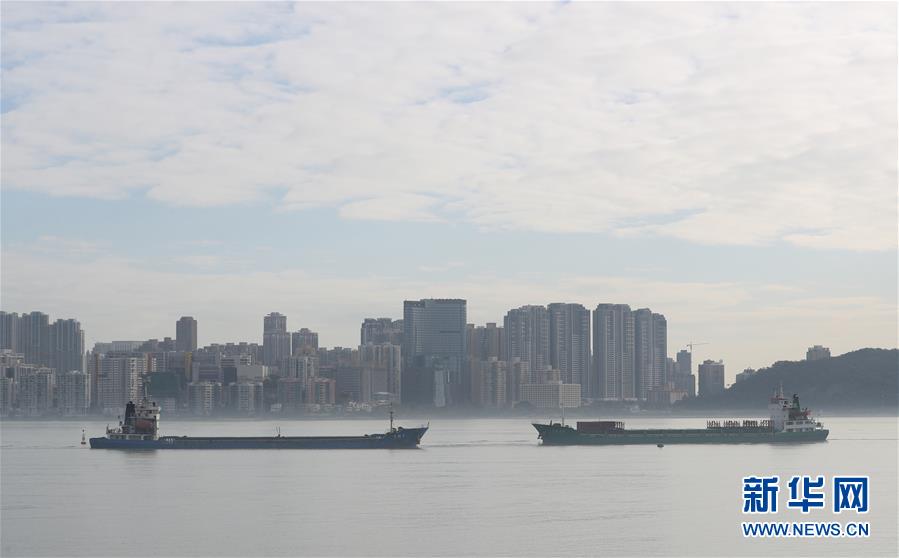 在澳門(mén)友誼大橋附近海域,兩艘船相向而行(12月17日拍攝)。新華社記者李鋼攝