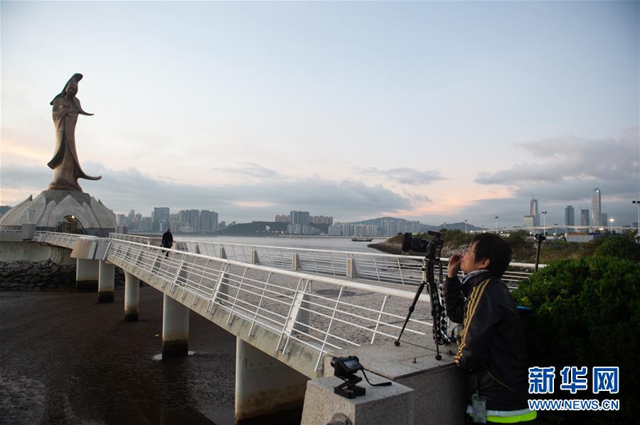 12月17日,一名女子在澳門(mén)拍攝日出。新華社記者杜宇攝
