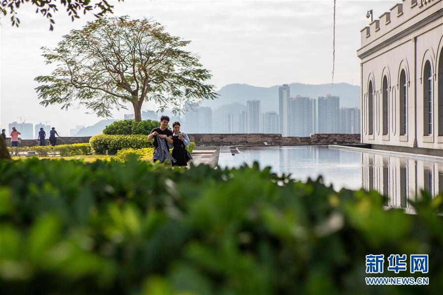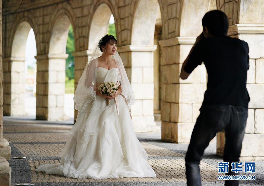12月17日,女子穿著婚紗在澳門(mén)漁人碼頭拍照。新華社記者王申攝