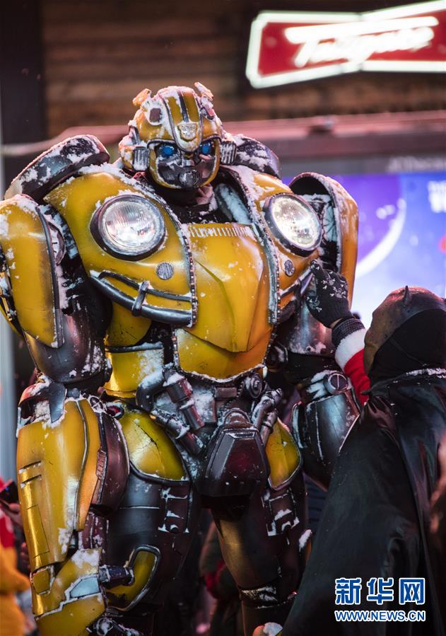 12月18日,在美國紐約時報廣場,一名打扮成動漫人物的街頭表演者為同伴清理積雪。新華社記者 王迎 攝