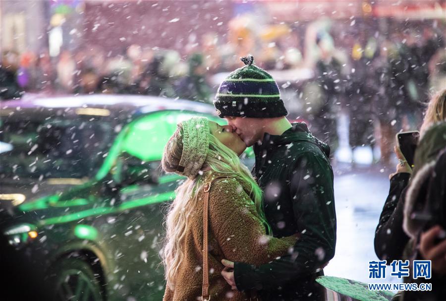 12月18日,在美國紐約時報廣場,一對情侶在雪中擁吻。新華社記者 王迎 攝
