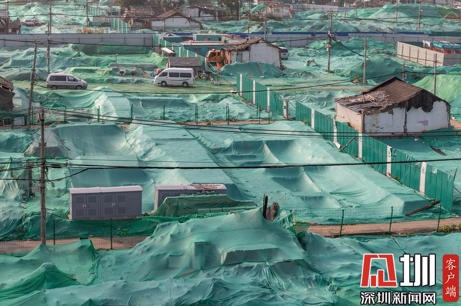 圍擋內(nèi),工地大部分被綠色苫布覆蓋,只露出幾處規(guī)整的探坑??脊殴ぷ髡哒诰o張忙碌中,有些工作人員戴著草帽,坐在馬扎上記錄發(fā)掘細節(jié),還有一些穿著藍色背心的工作人員使用工具正在做清理工作。