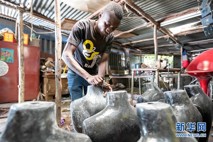 12月20日,在肯尼亞內(nèi)羅畢庫(kù)奧納藝術(shù)中心,一名藝術(shù)家制作裝置藝術(shù)作品。  新華社記者 王騰 攝