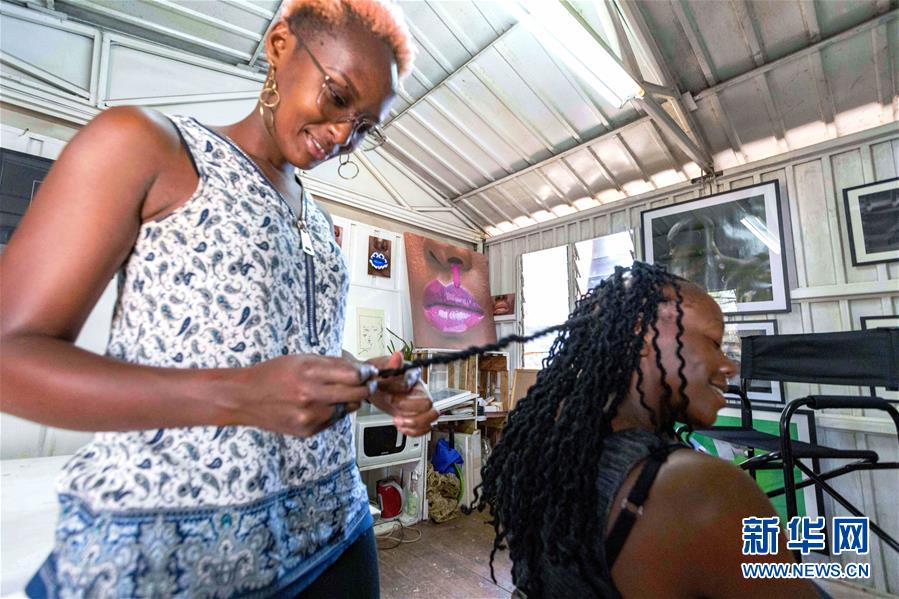 12月20日,在肯尼亞內(nèi)羅畢庫(kù)奧納藝術(shù)中心,一名藝術(shù)家為游客編辮子。  新華社記者 王騰 攝
