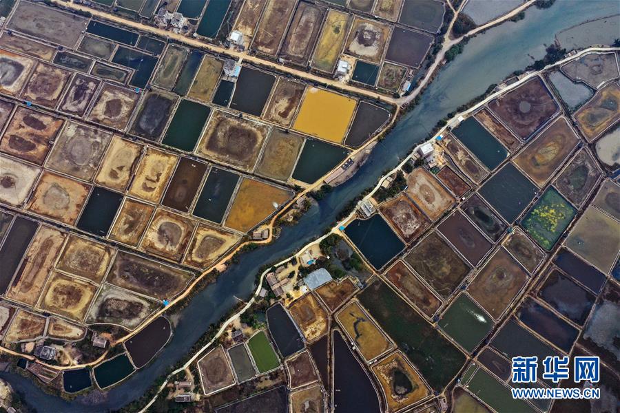 12月21日無人機拍攝的廣西合浦縣黨江鎮(zhèn)更螺圍出??诘奈r塘。冬日,廣西廉州灣海域風光別致。新華社記者張愛林攝