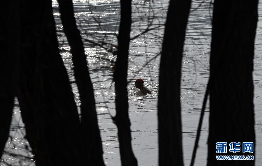 12月20日,83歲的冬泳愛好者周漢英在黃河冬泳。新華社記者陶希夷攝