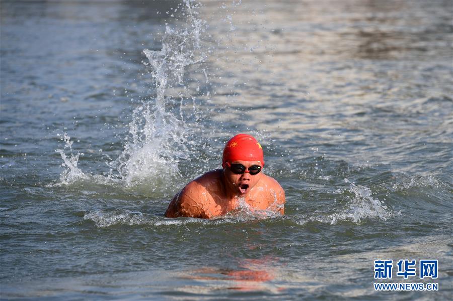 12月18日,冬泳愛(ài)好者張敏捷在黃河冬泳。新華社記者馬寧攝