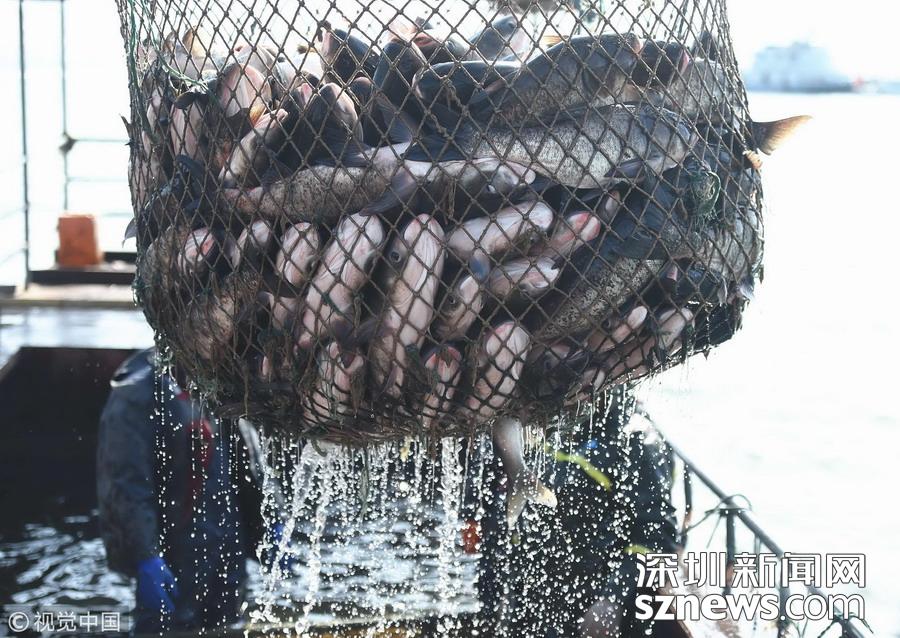 當(dāng)日,浙江省杭州市淳安縣千島湖中心湖區(qū)上演巨網(wǎng)捕魚,30余名捕撈隊(duì)員經(jīng)過半個多小時拉網(wǎng),獲得大豐收。