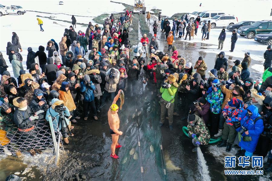 12月18日,一名冬泳愛好者展示冬捕魚(無人機(jī)拍攝)。新華社記者劉磊攝