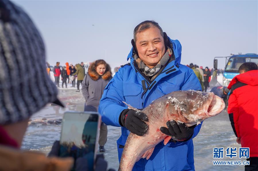 12月26日,在吉林松原查干湖冰面上,游客手捧剛打撈上來的魚拍照留念。隨著吉林松原查干湖冬捕知名度不斷提高,全國各地消費(fèi)者對查干湖魚的需求量逐年增大。2014年開始,多個電商平臺和快遞企業(yè)紛紛抓住商機(jī)進(jìn)駐查干湖。經(jīng)過多年發(fā)展,借助互聯(lián)網(wǎng)銷售優(yōu)勢和日趨完善的快遞網(wǎng)絡(luò),全國多地的百姓可以在魚出水后的48小時內(nèi)品嘗到查干湖魚的鮮美滋味。新華社記者張楠攝