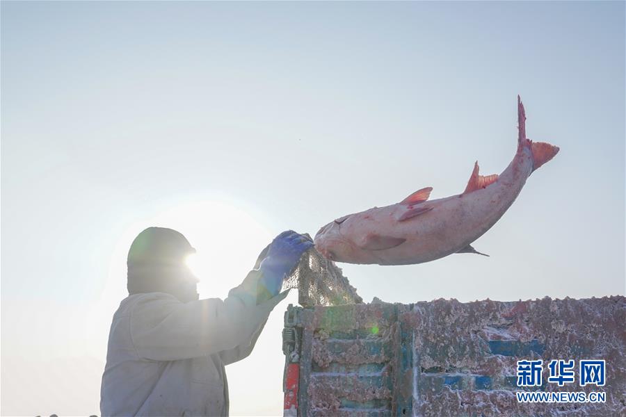 12月27日,在查干湖冰面上,工人將剛打撈上來的大魚扔上貨車。新華社記者張楠攝