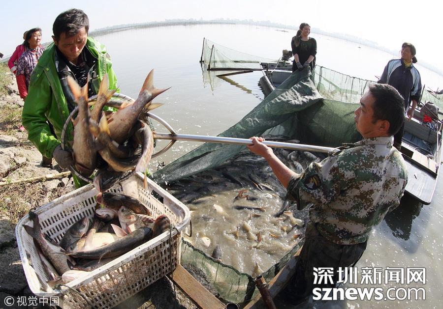 江蘇揚(yáng)州,漁夫?qū)Ⅳ~撈出過秤。