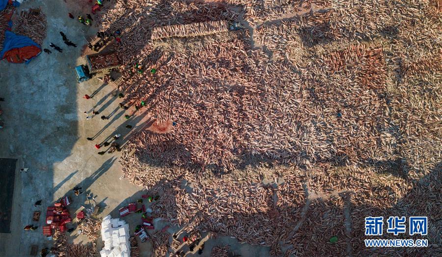 12月18日,工作人員將“頭魚”懸掛起來,準(zhǔn)備售賣。新華社記者劉磊攝